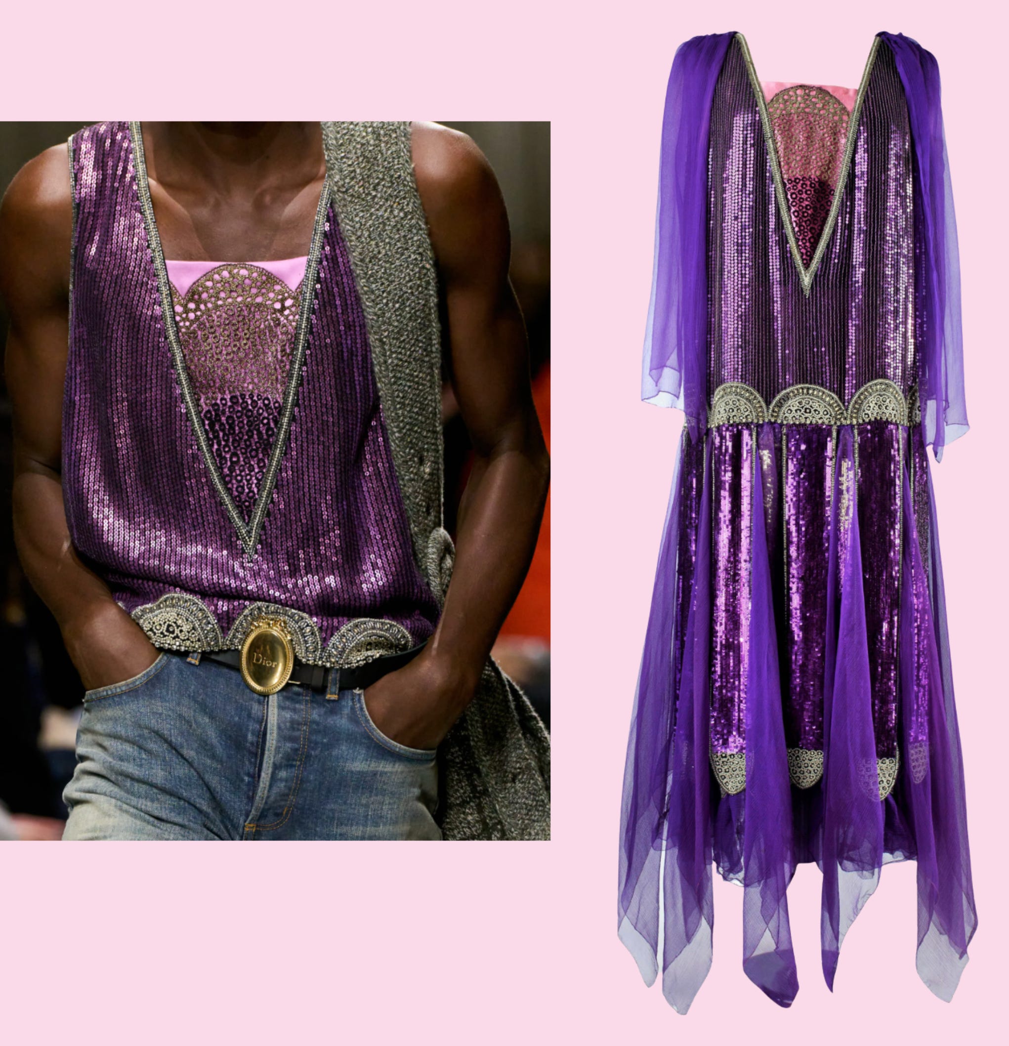Though at first glance the show reads more like a JW Anderson collection than a Dior one, this was not a case of ignoring the archives. On the contrary, Anderson moved beyond Dior’s own history, tracing Christian Dior’s influences back to Paul Poiret — an early 20th-century couturier whom Dior deeply admired. Anderson has shared that a thrifted Poiret dress was a major inspiration for the collection. The opening tank tops, in particular, read as the clearest reference, appearing almost like a cut-down facsimile of a Poiret gown.