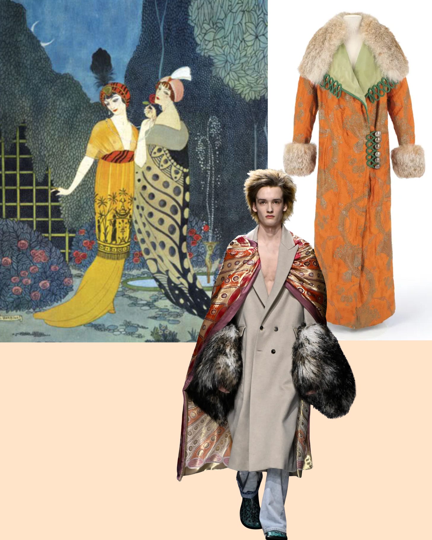 Poiret became a conceptual starting point — not only for silhouettes, but for his attitude toward dress as social signaling. His work fused references from the Middle East with neoclassicism and famously freed women from the corset, introducing loose, fluid silhouettes that prioritized movement. Looking at it side by side, the influence is undeniable.